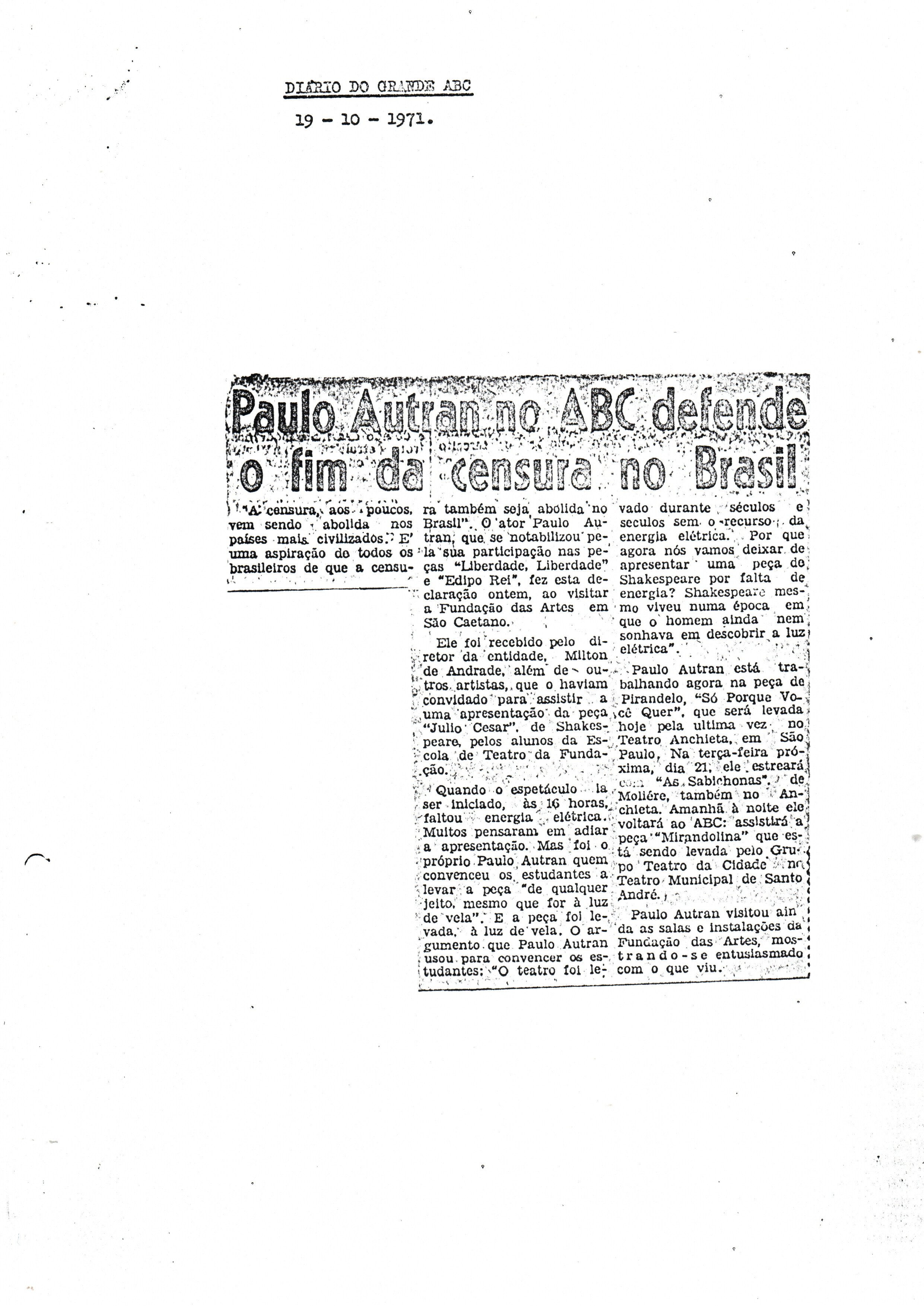 Em outubro de 1971, o consagrado ator de TV, cinema e teatro Paulo Autran visitou a Fundação das Artes para assistir ao espetáculo Julio Cesar e conversar com os alunos da Escola de Teatro, conforme relatado na edição de 19 de outubro do Diário do Grande ABC.5 - Paulo Autran