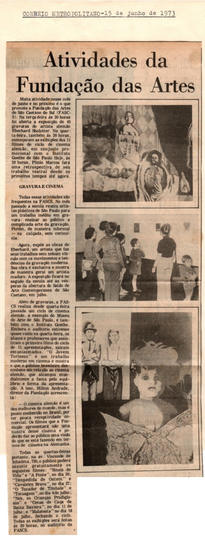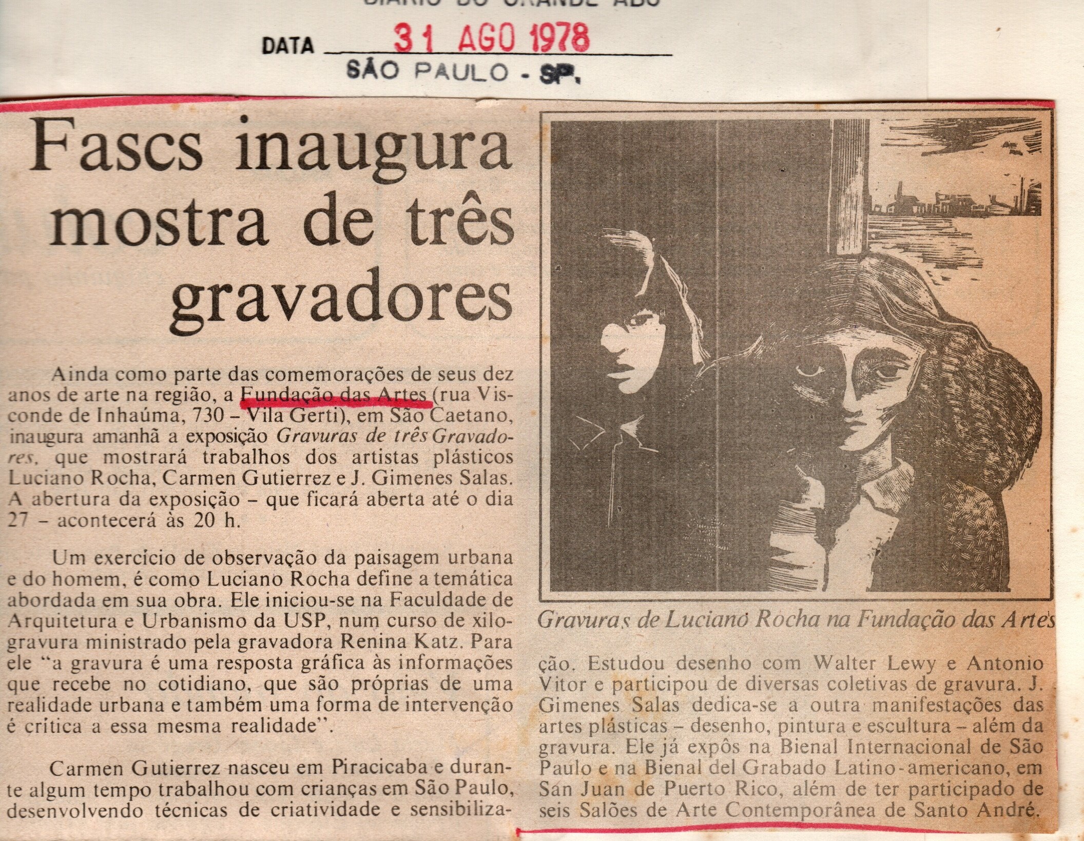 Para marcar a primeira década de atividades, a Fundação das Artes realizou intensa programação ao público. Uma das atrações foi a exposição “Gravuras de Três Gravadores”, valorizando o trabalho de artistas brasileiros, noticiada no Diário do Grande ABC em 31 de agosto de 1978.