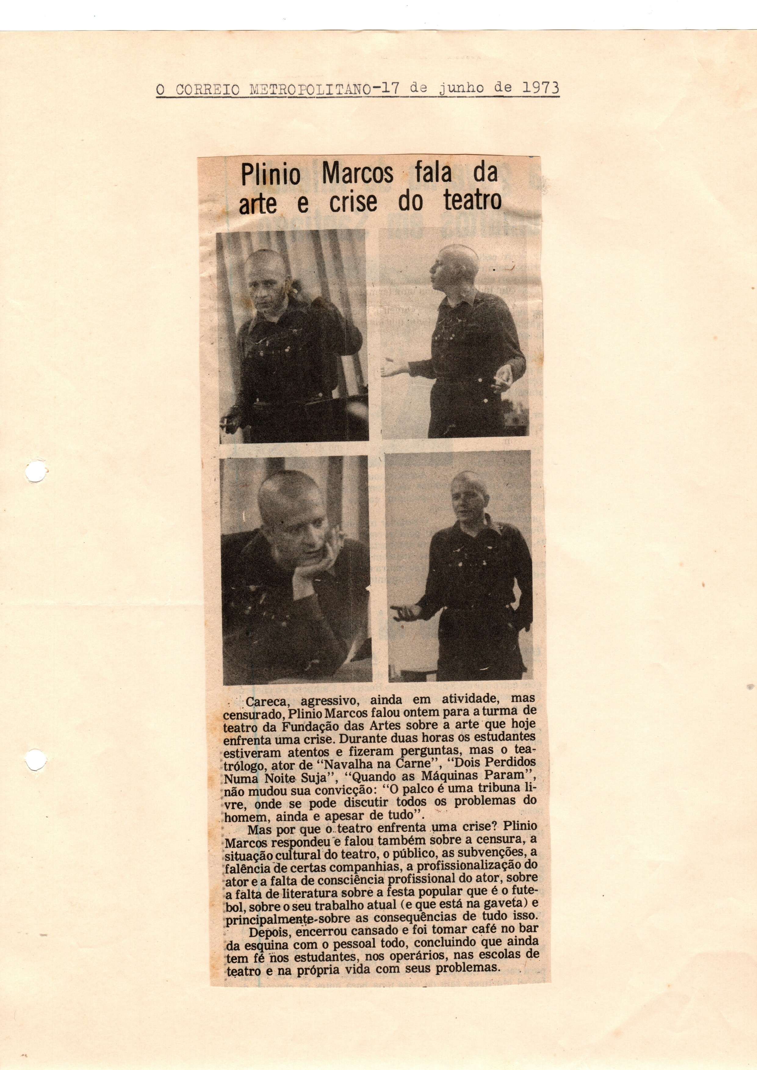 Nascido em Santos (SP), o ator, diretor e jornalista Plínio Marcos (1935-1999) escreveu mais de 30 peças de teatro, sendo um dos primeiros dramaturgos a retratar a vida do “submundo” da cidade de São Paulo. No período da ditadura militar, teve várias peças e textos censurados. Na década de 1970, esteve na Fundação das Artes para conversar sobre a profissão com os alunos da Escola de Teatro.
