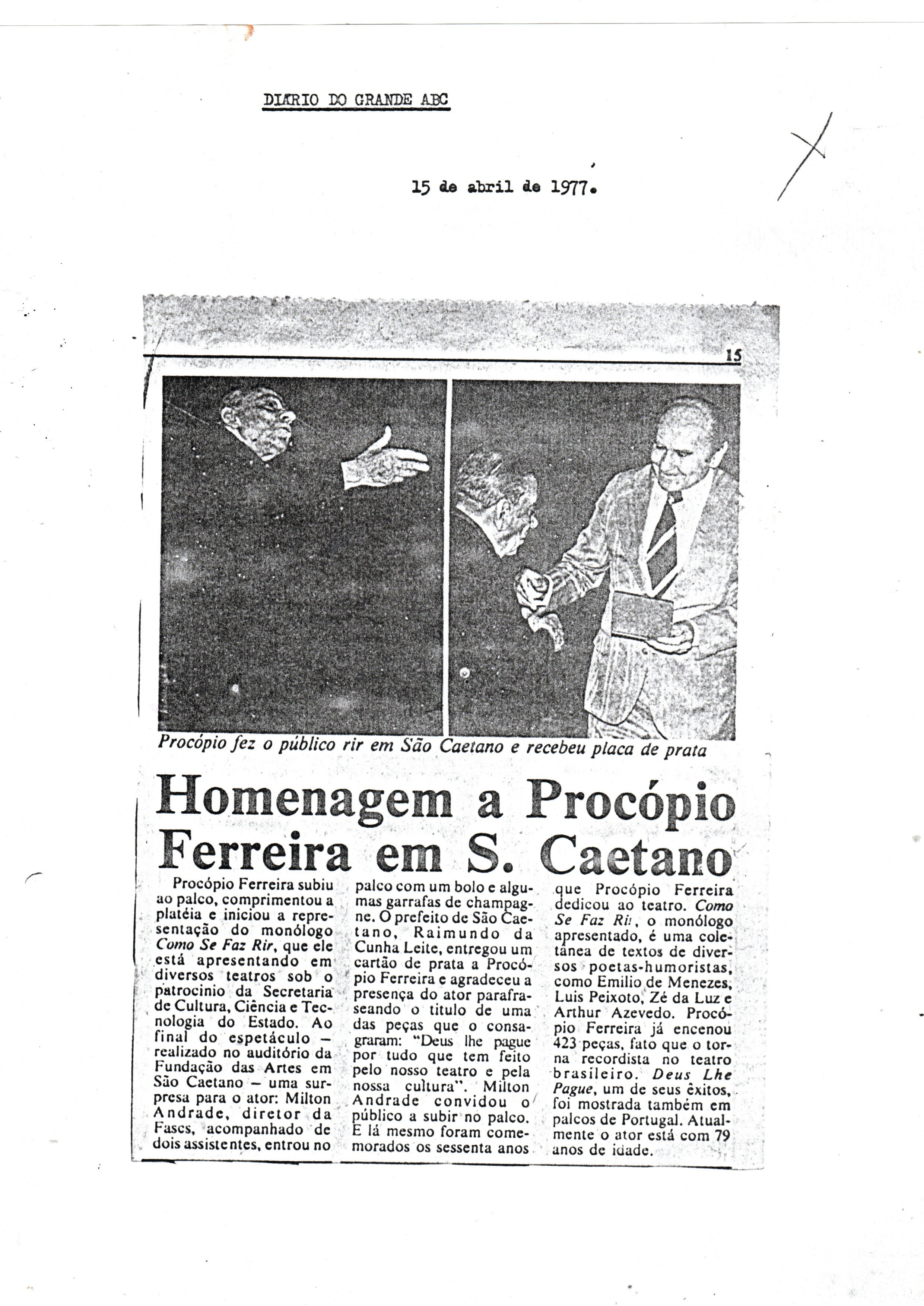 Considerado um dos grandes nomes do teatro brasileiro, o ator, diretor e dramaturgo Procópio Ferreira esteve na Fundação das Artes em 1977. No palco do Teatro, recebeu uma homenagem do prefeito Raimundo da Cunha Leite e do diretor da Fundação, Milton Andrade, em comemoração aos 60 anos de profissão, conforme registrado no Diário do Grande ABC de 15 de abril daquele ano.