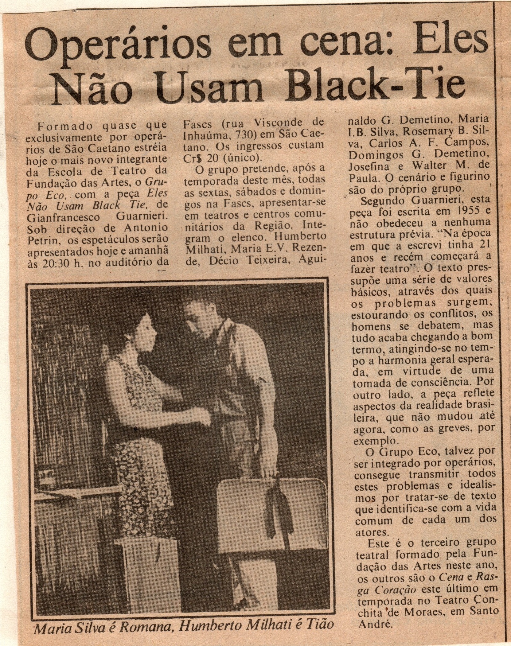 Peça de estreia de Gianfrancesco Guarnieri como dramaturgo, o espetáculo Eles Não Usam Black-Tie foi originalmente encenado em 1958 no Teatro Arena. Na Fundação das Artes, o Grupo Eco, formado por operários de indústrias da região do ABC, apresentou o espetáculo sob direção de Antonio Petrin, em julho de 1978. Também nessa época, foram formados outros dois projetos: o Grupo Cena, dirigido por Ulysses Cruz e o grupo Da farofa ao caviar, dirigido por Silnei Siqueira.